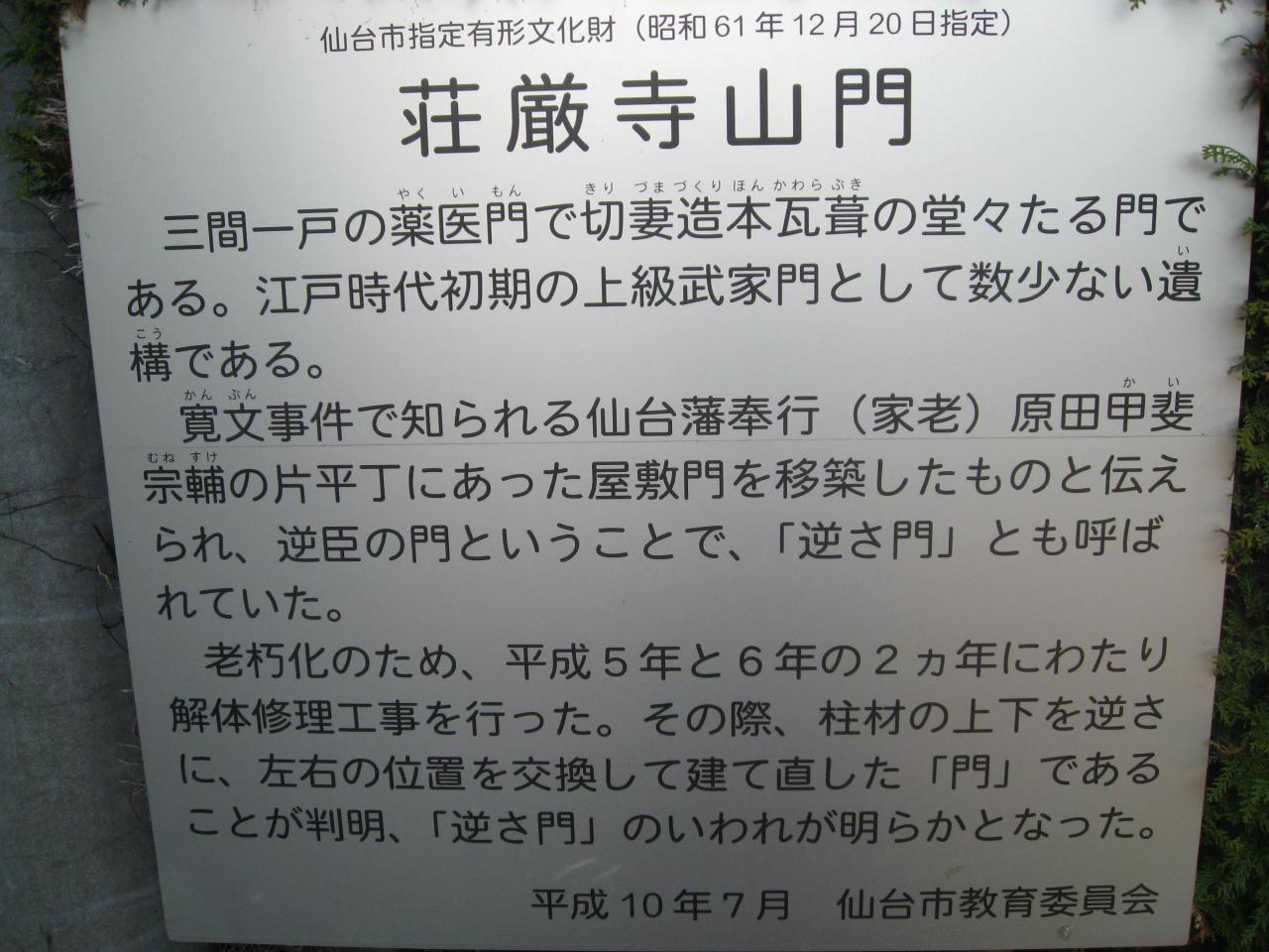有名な伊達騒動で原田甲斐一族は壊滅しましたが、屋敷の門だけは唯一残り、新坂通りの荘厳寺に移築されました。移築の条件が門を逆さに組みなおすことだったので、「逆さ門」と呼ばれています。