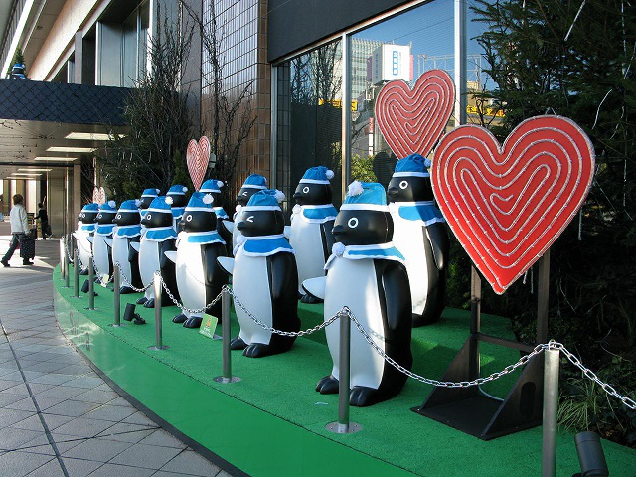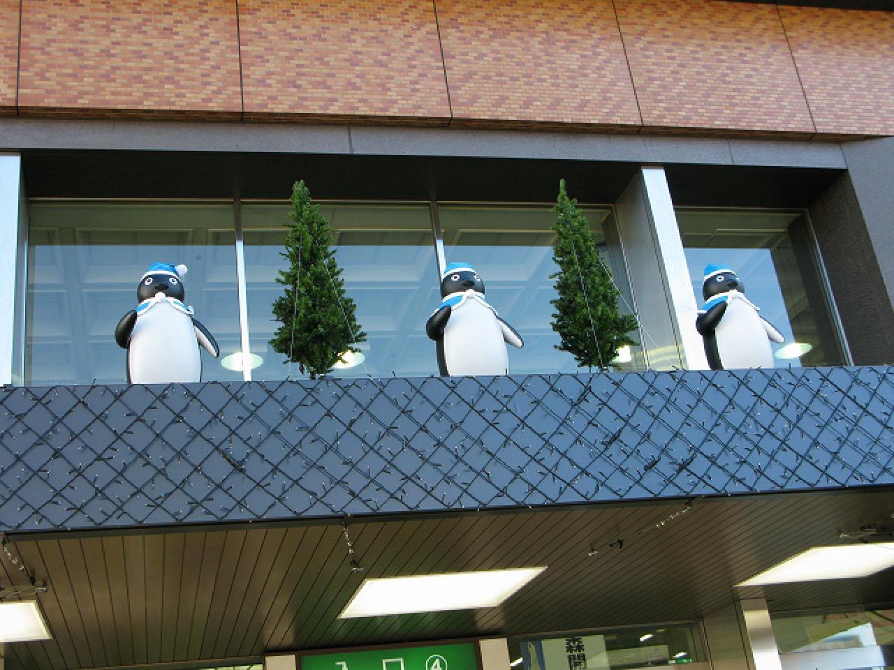 駅舎の前に、ずらっと並んだスイカのペンギンさんたち?