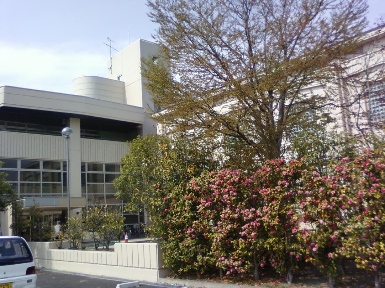 七郷市民センター前、植え込みに、サザンカでしょうか、ツバキでしょうか八重咲きの紅色の花が咲いています。市民センターは今、大震災被災者の避難所としても使われています。