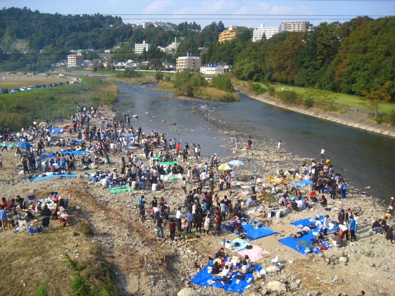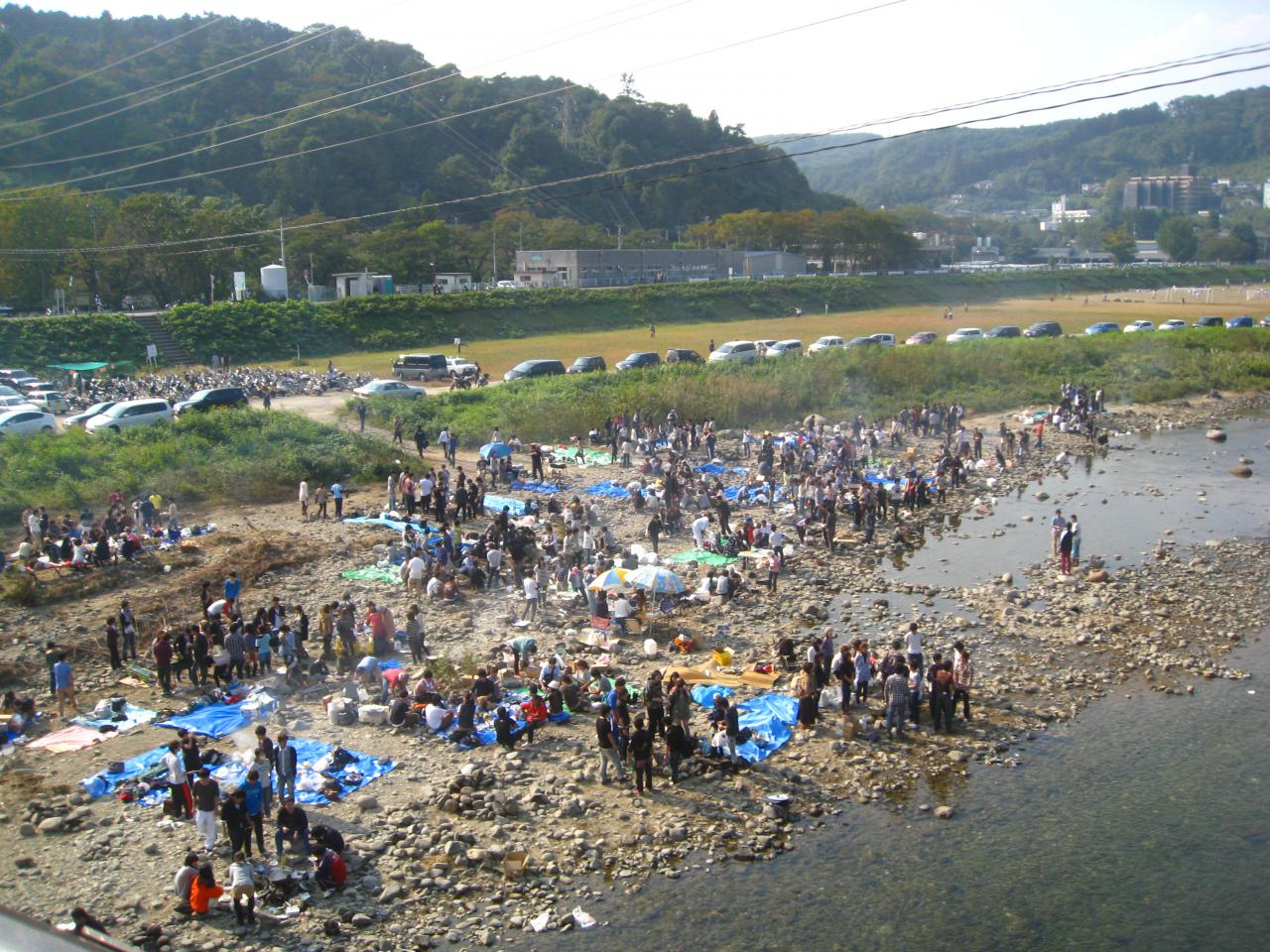 体育の日は天気もよく、仙台の芋煮会の定番スポット牛越橋の下は芋煮の人たちでいっぱいでした。この前の台風で河原が少し狭くなったので、場所取りは大変そうです。