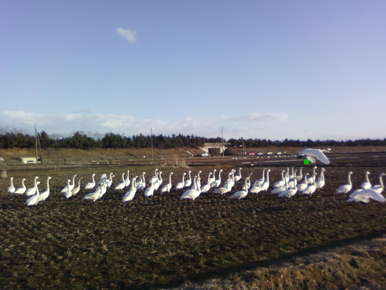 藤田地区の田圃だったところに白鳥の群れが羽を休めています。