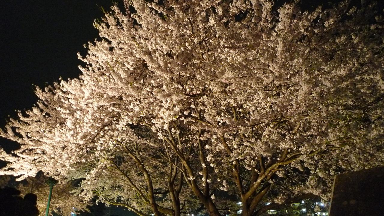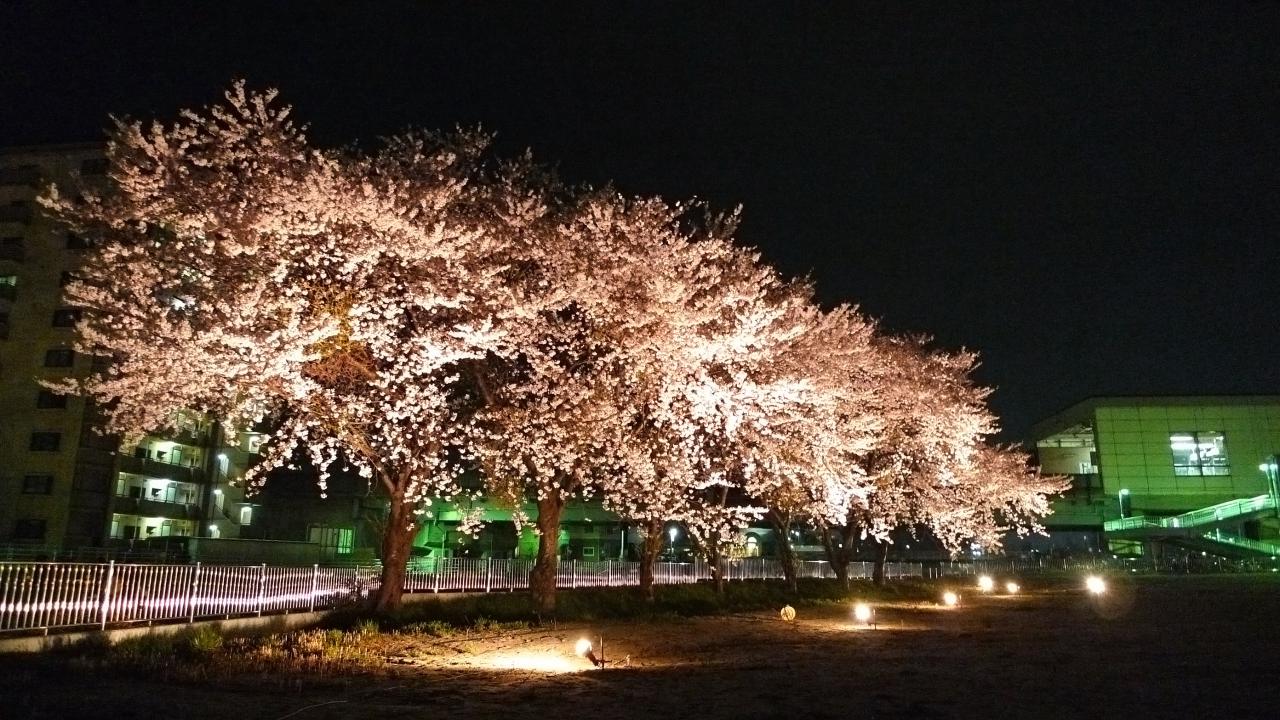 富沢駅近くの笊川では、満開になった桜が夜間ライトアップされています。