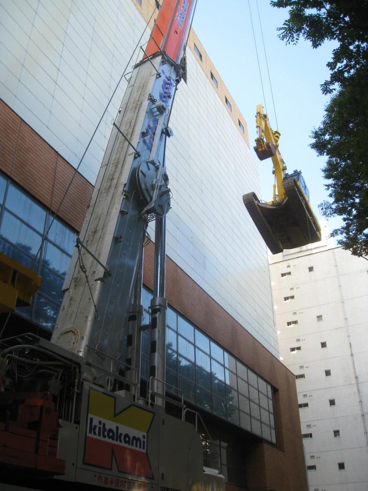 旧エクセルホテル東急仙台の建物解体工事現場で、大きいショベルカーがクレーン車にいとも簡単に吊り上げられていました。13階建ての屋上まで、3機も吊り上げるそうです。