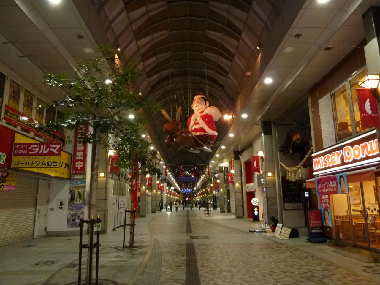 クリスロードアーケード内に吊られたトナカイに乗った仙臺四郎のサンタクロースです。