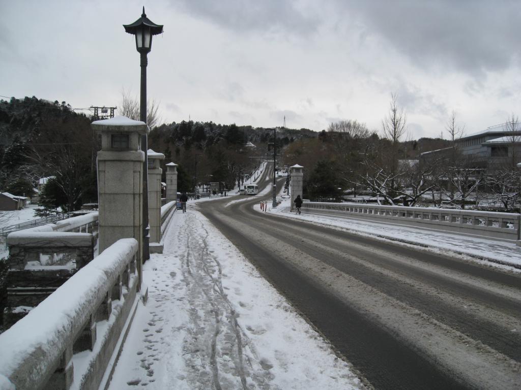 雪が積もった日の広瀬川の風景です。大橋から下流の方向です。