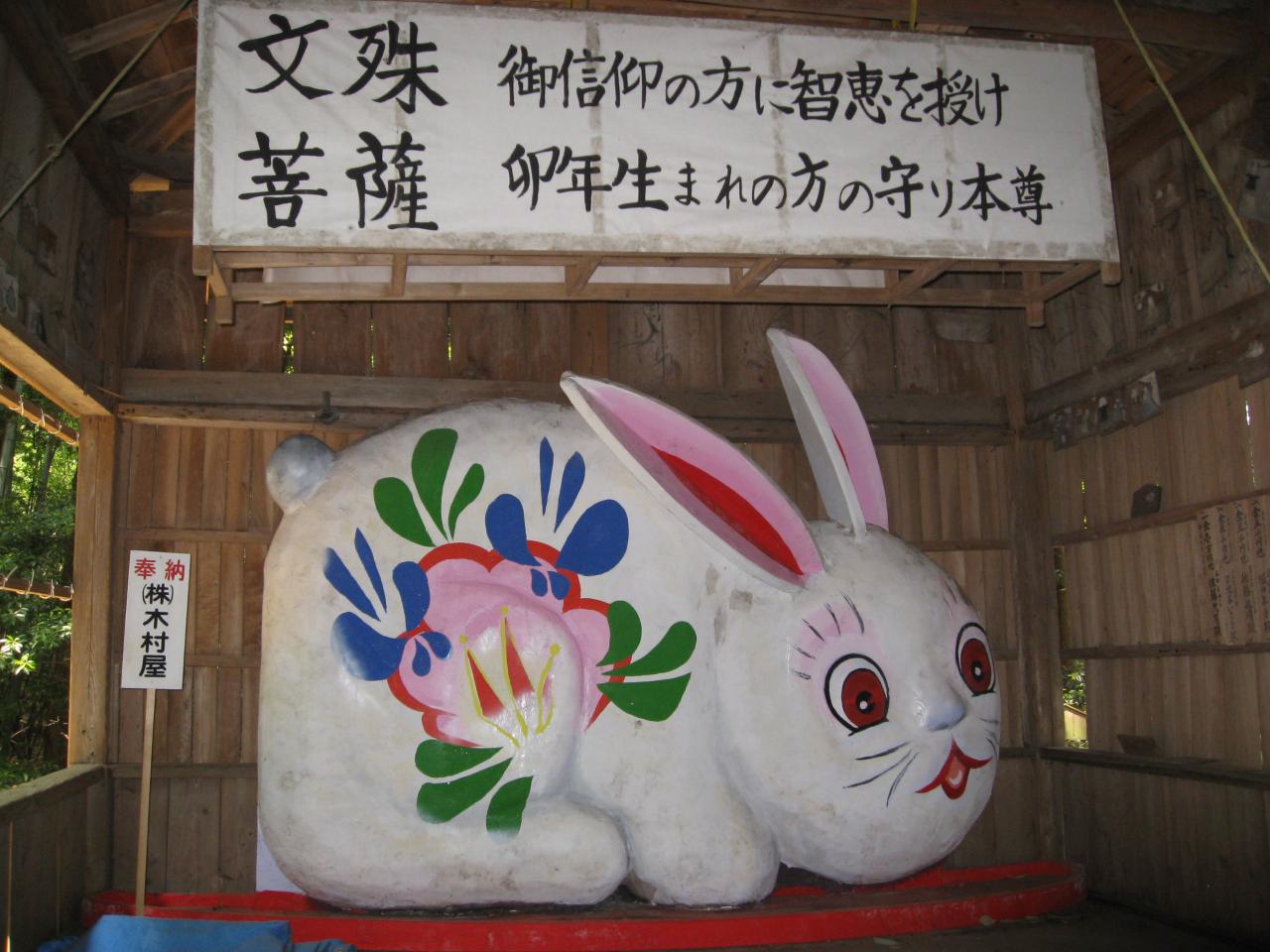 国道48号線沿いにある文殊堂は歴史も古く、卯年の守り本尊として親しまれています。ウサギのつくりものが瓦の上や参道脇にあったり、なかには大きいのもあったりします。