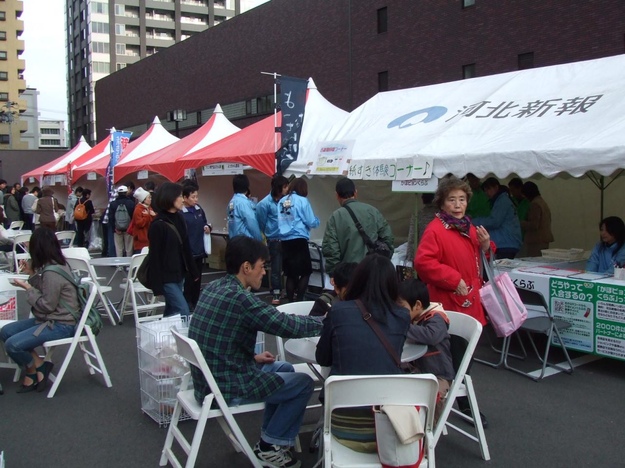この日は河北新報社で宮城ブランドの推進と情報発信を目的とした“宮城いいものまつり”が開催されました。開始時間前から予想を超えるたくさんの人が訪れ、地域ブランドの各ブース、イベントが大盛況。皆さん楽しまれたようです。