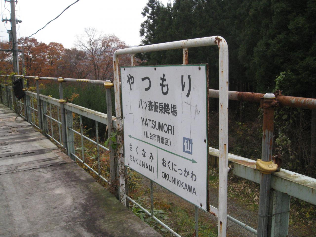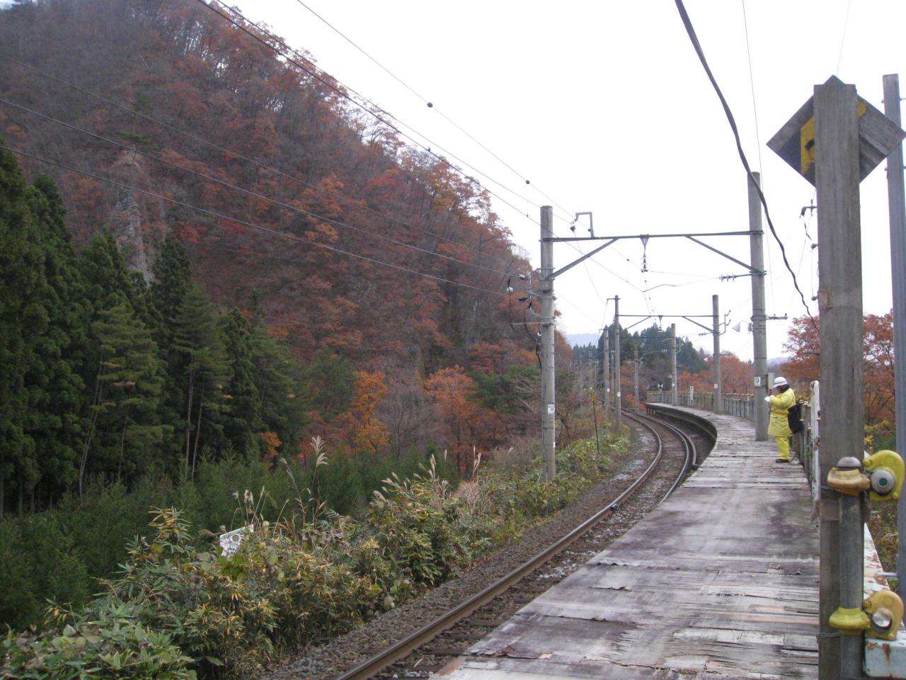 仙山線の作並駅と奥新川駅の間にある八ツ森駅は、簡易ホームがあるだけの臨時駅です。かなり奥地にあり、今は電車は一本も止まりません。この時はちょうど、点検している作業員の方がホームにいました。