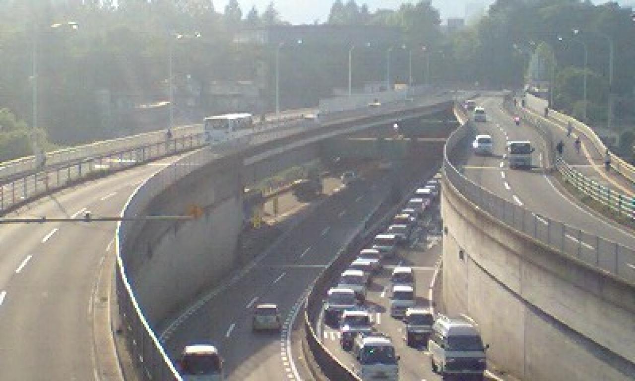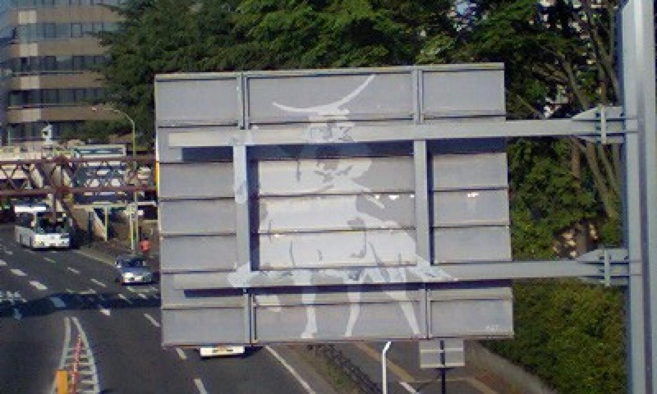 西道路の立町トンネル西公園口出口から右前方を見上げると、道路標示板の裏へ伊達政宗像のシルエットが描かれています。ちょっとしたアイディアが町並みが豊かになりますね。