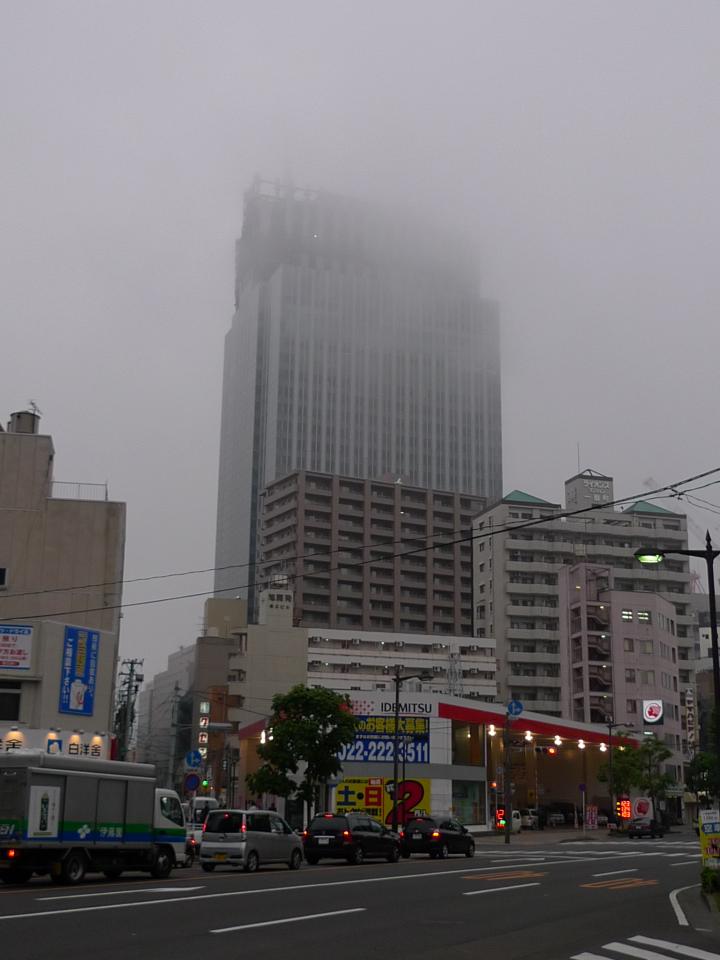トラストタワーも霧で覆われて最上部が見えなくなっています。