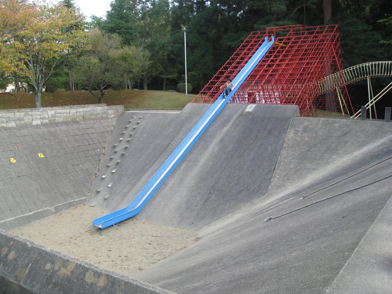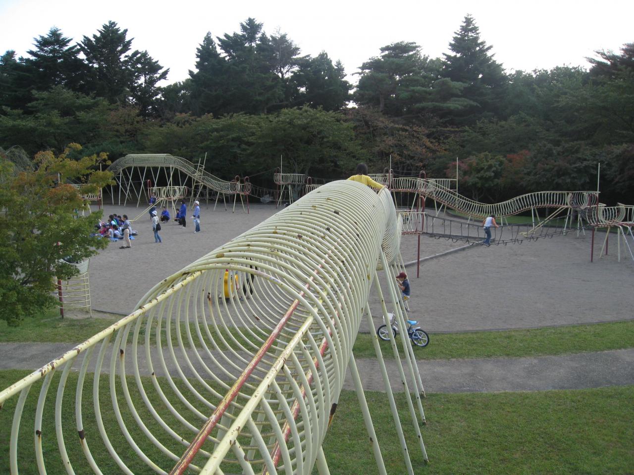 鉄製の長いアスレチック遊具や、長いすべり台、芝生などがあります。