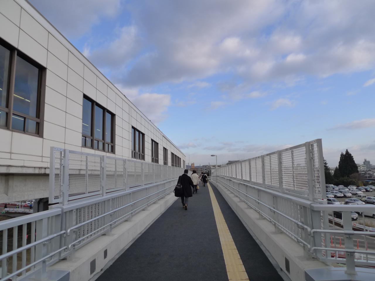 2009年12月24日から利用できるようになった「富沢駅歩行者用立体横断施設」です。今年6月に半断面暫定開通した都市計画道路郡山折立線を渡るためのもので、2階デッキからは、直接富沢駅2階改札口前まで行くことができます。