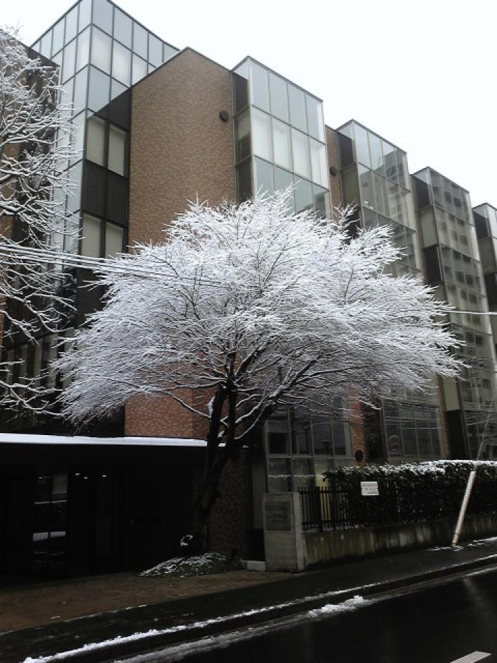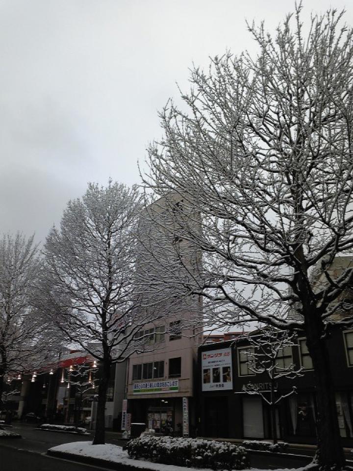 昨晩から降り続いた雪もひと段落。気温も高めなので足元の雪は概ね解けていますが、通勤路の桜や銀杏の枝に白い花びらが…。